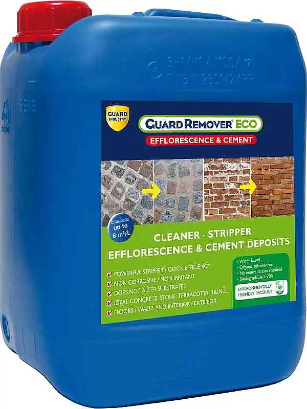 Guard Remover® Eco Efflorescence & Cement is a patented new generation cleaner and stripper that uniquely removes cement, concrete, efflorescence and lime from any substrate. It is significantly less hazardous than other acid-based products on the market. It is non corrosive and non irritant. It requires no neutralisation after rinsing with water.